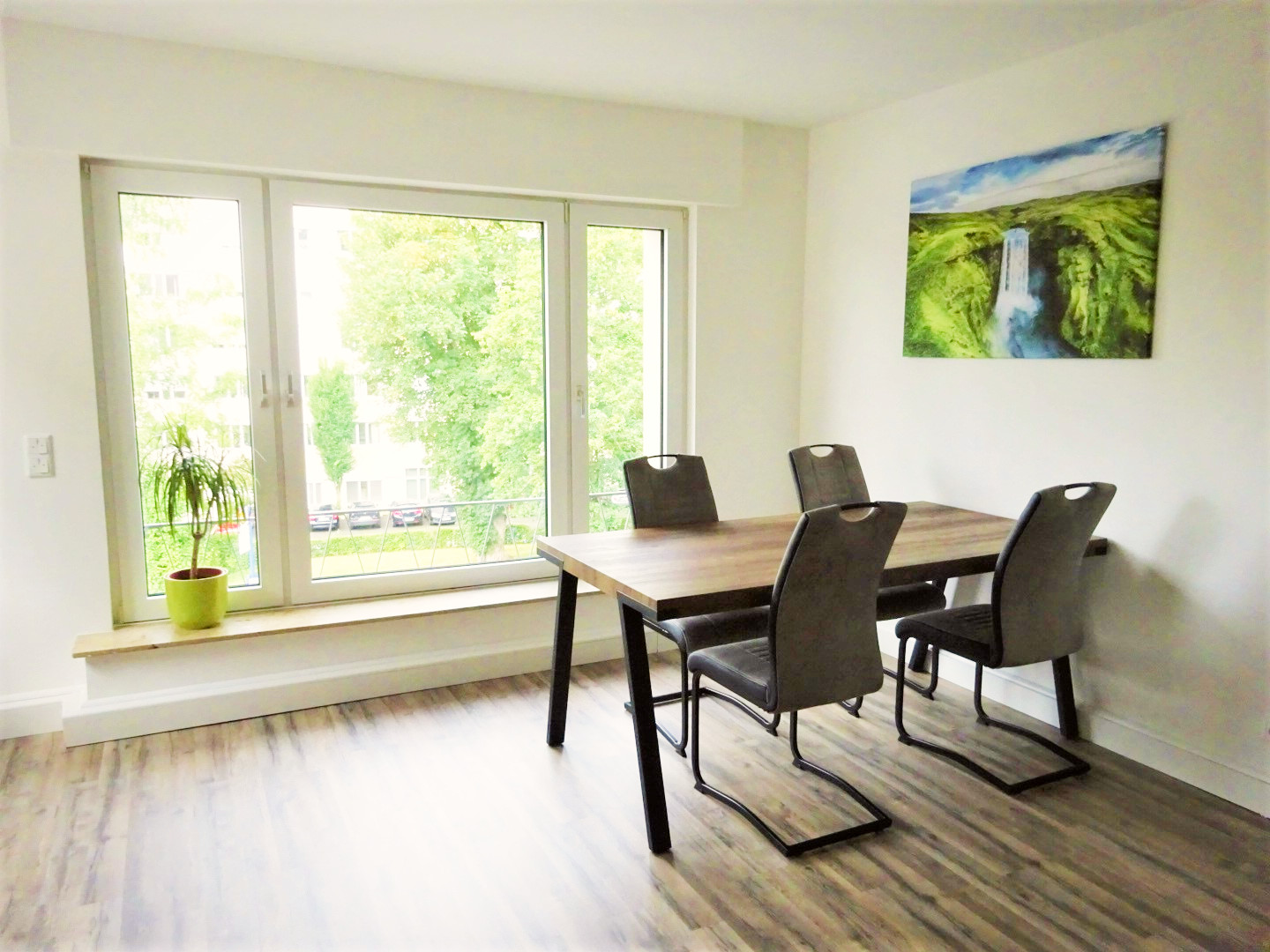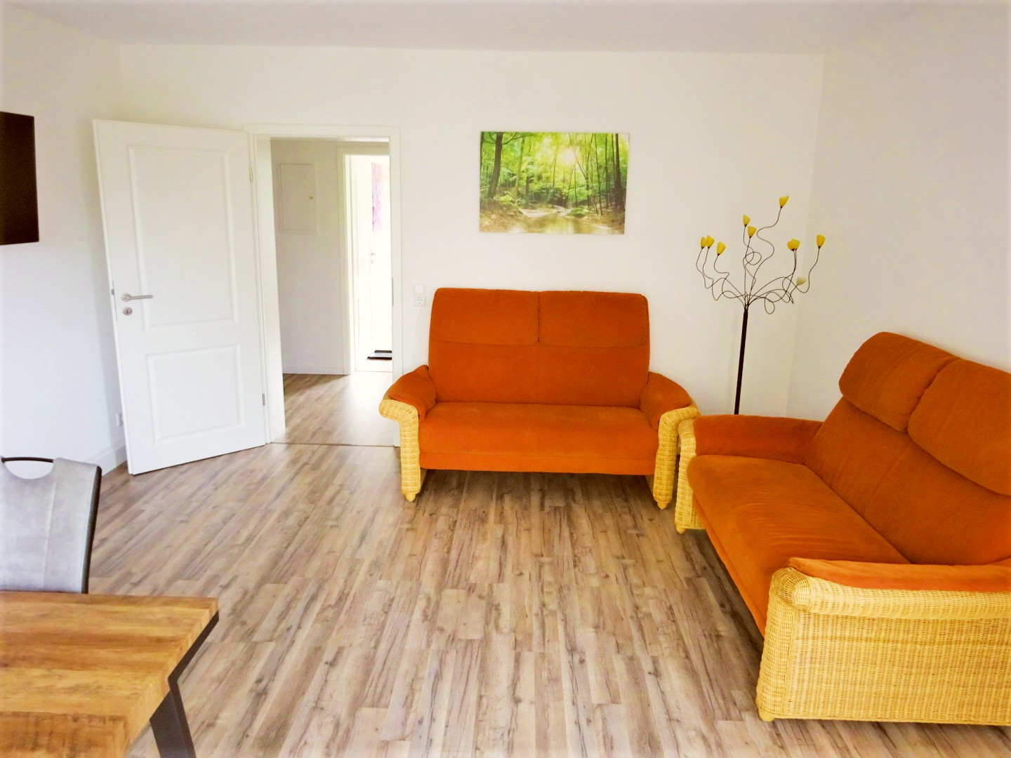 Im Wohnzimmer können Sie es sich auf dem Sofa oder am großen Esstisch gemütlich machen. Ein Smart-TV sorgt für die abendliche Unterhaltung. Die Küche ist mit den alltäglichen Gebrauchsgegenständen ausgestattet und bietet Ihnen topmoderne Elektrogeräte. Der Blick ins Grüne rundet diesen Raum ab.